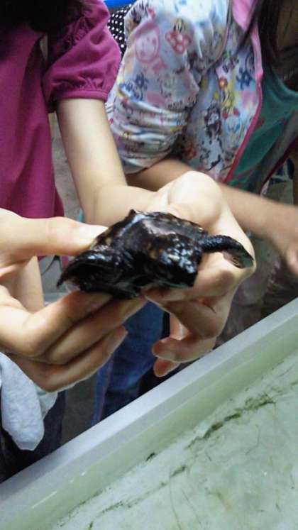 初めて触る亀の赤ちゃんに、子どもたちは興奮ぎみでした。