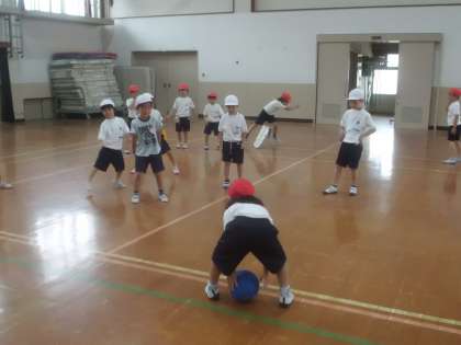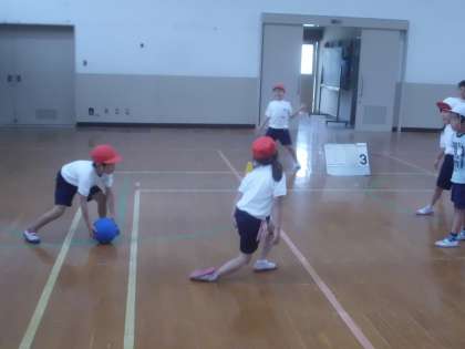 今日はあいにくの雨だったので,体育の学習は,体育館で「ころがしドッジ」を行いました。逃げるチームとボールを転がすチームに分かれ,試合を行います。ルールは,転がしたボールで相手の足に当てたら1点,3分たったら,逃げる方と転がす方を交代するというものです。本格的なボールゲームは入学後初めてでしたが,子ども達はすぐルールを覚え,声をかけながら力いっぱい活動しました。ボールを一回もさわっていない人にボールを譲ってあげたり,自分のチームを大きな声で応援したりと素敵な場面もたくさん見られました。次は,休み時間に運動場で楽しむ姿が見られるかもしれません。
