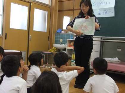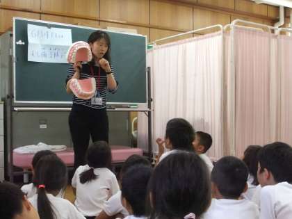 体重測定の日に,養護教諭の樋口先生から,6月4日は虫歯予防デー6月は歯を大切にする話を聞きました。