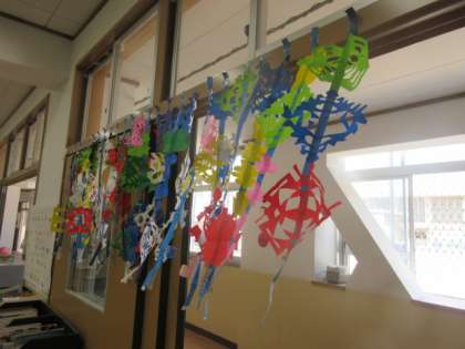 5月の終わりに図工科「ちょきちょきかざり」で作ったのれんを教室の入口に飾っています。