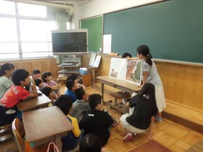 読書係からの読み聞かせ中。みんな食い入るように見ています。
