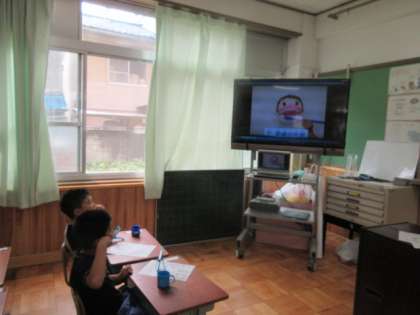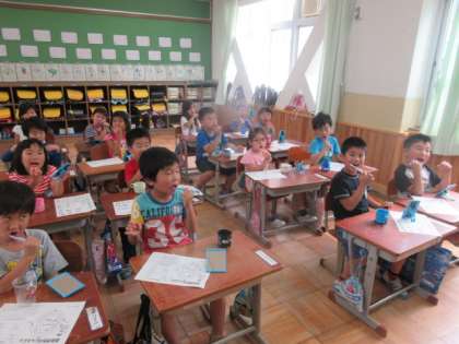 歯みがきテストで自分の苦手なところや歯の磨きにくいところを確認した後に,みんなで「みがき方のコツ」を意識しながら一緒に歯を磨きました。