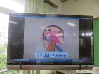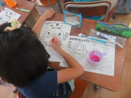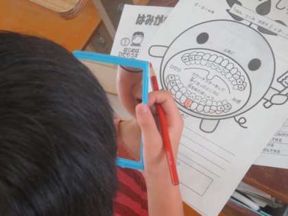 学活の時間にカラーテスター錠を使って正しく歯を磨けているか確かめました。歯の身欠き残しがあるところが赤く残りました。最後にビデを見ながら歯磨きの順番を確かめました。学習が終わり,磨けているところと磨けていないところが分かりました,明日からも丁寧に毎日歯を磨気体と思いましたとプリントに感想を書いていました。