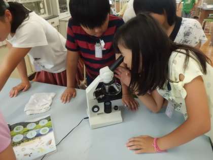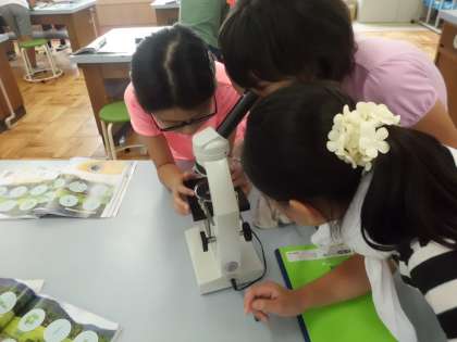 理科の学習では,顕微鏡を使った観察をしました。水の中にはどんな生き物がいるのか,光学顕微鏡を使って探す子どもたち。「アオミドロがいた!」「ツリガネムシがいた!」と教科書に載っている生き物を探して大興奮!目には見えないたくさんの生物がいることに気づくことができたようです。