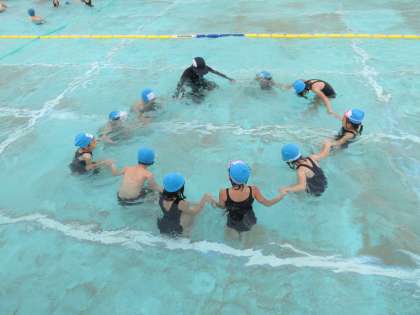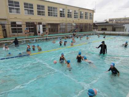 「みずあそび」の学習の流れにも慣れてきた1年生。水慣れをしたあと,今日は,「もぐる」というめあてをもって,学習に取り組みました。トンネルや水中じゃんけん,水かけ,ボールを使っての水中ドリブルなど,自分の力に合った学習の場を選び,ペアの友だちと熱心に取り組む姿が見られました。「鼻から息を出すことができたよ」「顔を水に初めて長く浸けられたよ」など興奮気味に話す子どもたち。次は,「うく」というめあてをもって頑張ります。