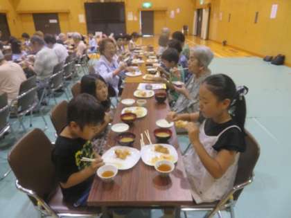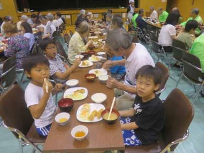 楽しい遊びも終わり。最後に一緒に食事をしました。食事の前に配膳のお手伝いをしました。お年寄りの方ともずいぶん仲良くなり楽しいお食事会になりました。