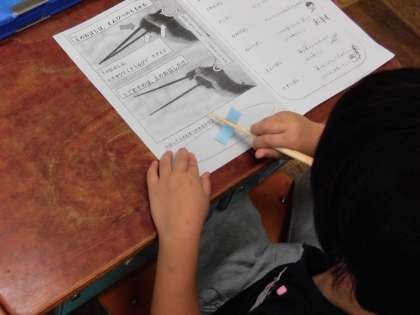 最後は,「おはし名人になろう」というプリントを使い,まとめをしました。おはしで食事する時のマナーについても学習しました。「よせばし」「なみだばし」「さしばし」「ねぶりばし」など,教えてもらい,持ち方とマナーに気をつけておはしを使えるようにと感じた子ども達でした。