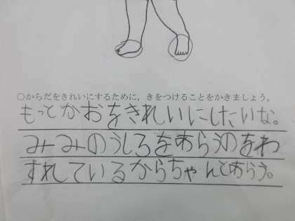 入浴の方法についても,絵で示しながら説明すると,自分の入り方と比べて,できていないことや自分が気をつけてやっていることに気がつき,あらためてからだをせいけつに保つためにがんばりたいという声が聞かれました。