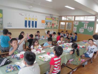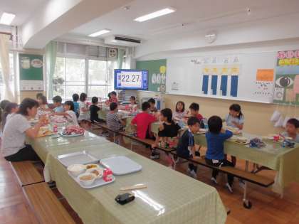 プール後の給食とランチルームで