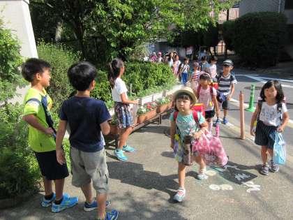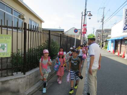 1年生は,登校班のお兄さんやお姉さんにリードしてもらい,地域の方に見守られながら学校へ来ます。