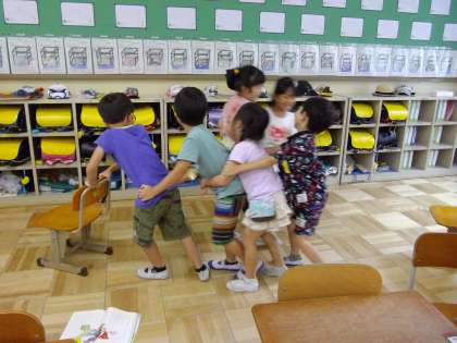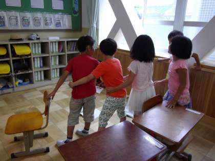 国語科の「おおきなかぶ」の学習で取り組んでいる音読劇。自分で考えたセリフを入れながら「うんとこしょ,どっこいしょ」と,椅子をかぶに見立て,引っ張る様子を演じる子どもたち。なかなかの演技派です。「どうやったら抜けるかのぉ」「おい,まごや。犬を呼んできておくれ」「はーい,おばあちゃん」と楽しみながら取り組む姿が見られました。音読発表会が楽しみです。