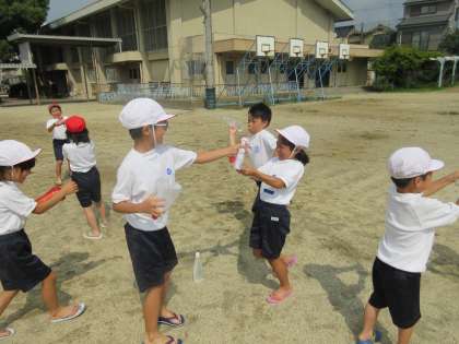 空のペットボトルや容器に水を入れて,地面にお絵描きしたり,水かけっこしたり,砂山に立てられた旗を倒したり,水飛ばし競争をしたりして楽しみました。