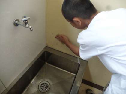 個人懇談会に向けて,学校をきれいにしようとがんばる子どもたち。手洗い場の壁に飛び散った絵の具や墨の汚れも残さず落としていきました。