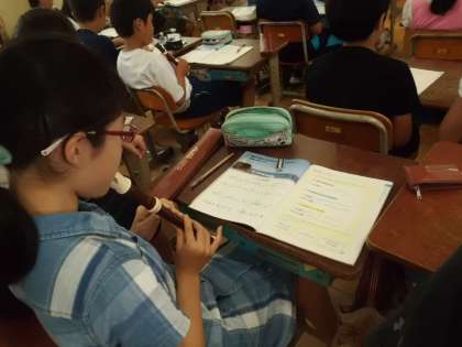 夏休みの宿題のリコーダー練習で取り組む「いつでもあの海は」の曲に挑戦しました。シのフラットに気をつけながら演奏しました。