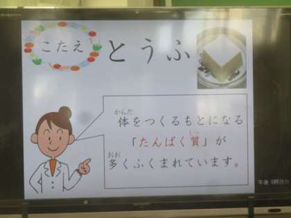 8月31日の給食は,麦ごはん,牛乳,豚肉ととうふのくず煮,もやしの煮びたし,じゃこでした。給食室からこんにちはでは,豆腐に関わるクイズが出てきました。クイズに正解し,子ども達は喜んでいました。