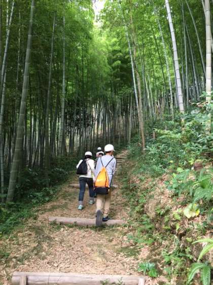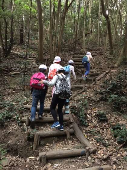 ウォークラリーに元気良くスタートしました。木ノ実やカニを見つけては,グループのみんなに紹介しています。「がんばれ!」と声をかけあって山道を歩いています。