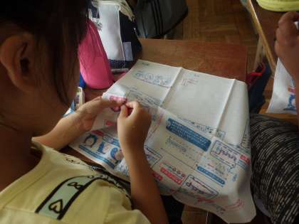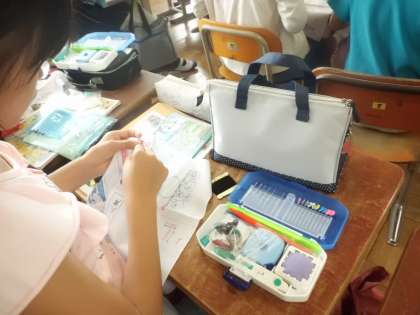 夏休み明けより,5年生では交換授業がスタート。家庭科は山本が担当。現在は裁縫の学習。練習布に玉結びと玉止めをたくさんしていきました。