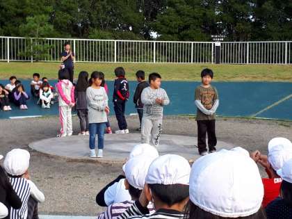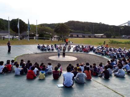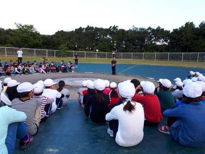 新林小学校と合同朝の集いです。朝の爽やかな空に子どもたちの澄んだ校歌が響きます。昨夜,充分に睡眠が取れたようで,みんなすっきりした良い顔をしています。今日も充実した1日になりそうです。旗揚げや学校紹介もとっても立派にできました。