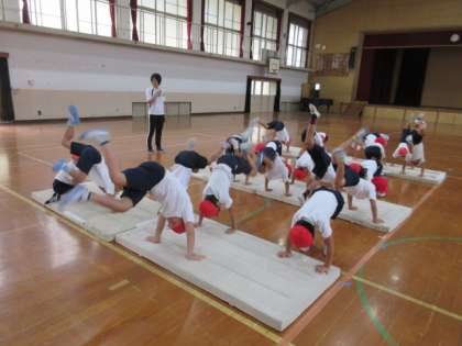 「マットあそび」の2時間目です。ウォーミングアップの「ゆりかご」や「ろばキック」では,身体が回転する感覚や手のひらに体重を乗せる感覚を確かめながら取り組みました。