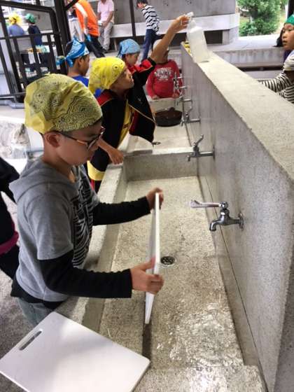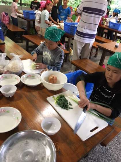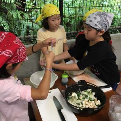 野外炊事が始まりました。玉ねぎを切る時に目が痛くなるようで,必死でこらえてがんばっています。