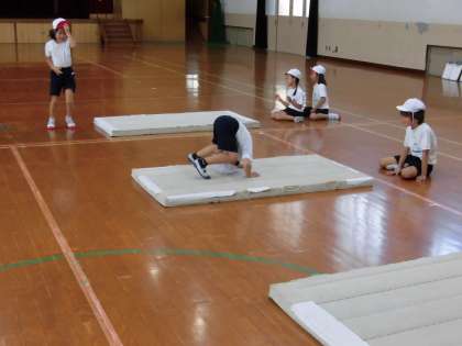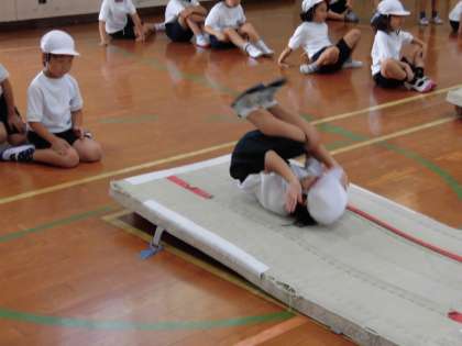 今週は,後ろ回りの練習もしました。マットの下に踏切り板を入れ,少し坂になったマットで,後ろ回りを練習するうちに,「あっ回れた」と喜ぶ子も出てきました。子ども達が練習していく中でみつけた後ろ回りのポイントは,「おへそを見る」「掌でマットを押す」「足は上じゃなく後ろにける」などなど。前回りに比べてコツがいる後ろ回りですが,友達同士お互い見あいっこしたり,自分に合ったマットを選んで練習したりする中で,ぜひ,「できた」と思えるようになってほしいです。