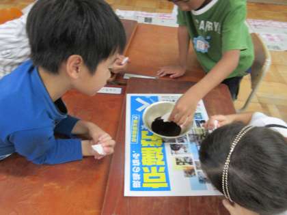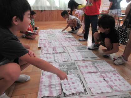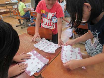 さて班ごとに配られた朝顔の汁に,折った和紙の端をチョンチョンと浸します。同じ折り方でも浸し方によって模様が変わります。折り方が違うと,想像もしなかった模様が現れます。和紙を開くたびに大歓声の子どもたちでした。