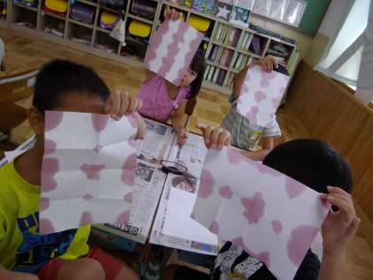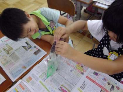 夏休みに,おうちで咲いたアサガオの花を使って,色水遊びをしました。ぎゅーっと花を絞ると,紫色の汁がたくさん出てきました。「すごぉい!いっぱい出てきたよ」「思っていたより濃い紫色だな」「もっといっぱい出してみよう」とグループで力を合わせて楽しんでいる様子が見られました。その後,色水を使って和紙を染めました。思い思いに紙を折り,色水をつける具合も工夫していました。ステキな作品に仕上がり,うっとりとした表情で和紙を眺める子どもたちでした。