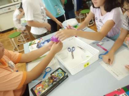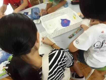理科「生命のつながり(5)」では,アサガオを使って学習を進めます。まずは,アサガオの花のつくりを調べました。花弁の枚数に秘密があることや花粉がついているところがあることに気づいた子どもたち。アサガオの花に興味を持ったようでした。