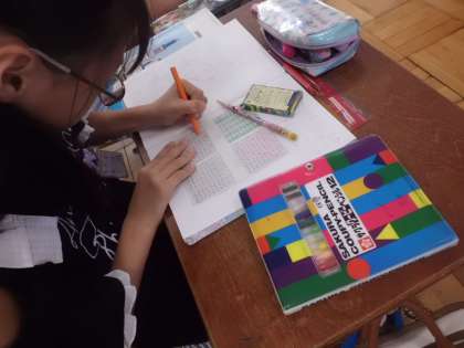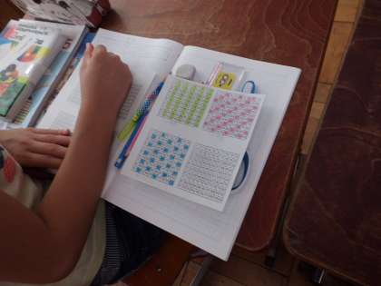 算数科「整数」では,1〜100の数表に,指定された倍数の数字に色をつける活動をしました。いろいろな数の倍数の色塗りをする中で,もようの規則性に気づく子どもたち。休み時間にも熱心に色塗りに励む姿も見られました。