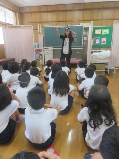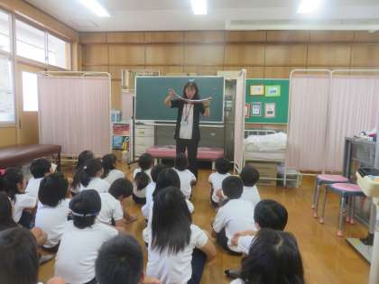 身体計測の前の保健の先生からけがの手当てと,血液に関わる話を聞きました。赤血球や白血球の働きについては以前学習したこともあり,先生の質問にもよく答えていました。