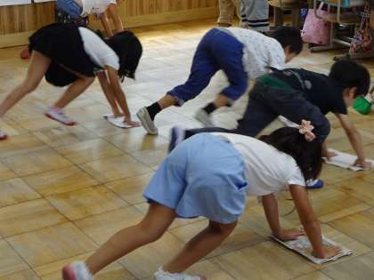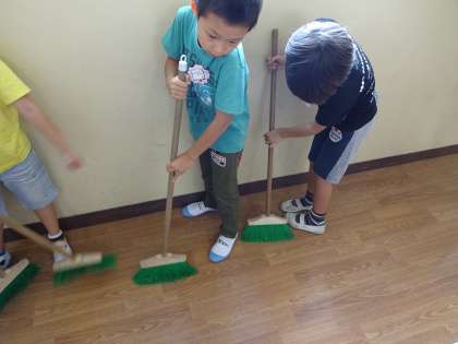 廊下の隅にある小さなごみを一生懸命にほうきで掃こうとしている姿や,重い砂とりマットを友達と協力して動かし,掃除をしている姿が見られました。