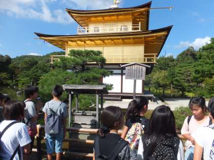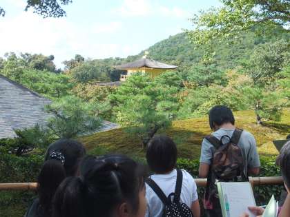 あるグループでは,金閣寺と龍安寺に向かいました。天候に恵まれたこともあって,金閣寺では,「写真で見るよりも輝いてる。」「上から見る金閣字も良い景色やなぁ。」など,金閣寺を生で見た感動を伝えてくれました。