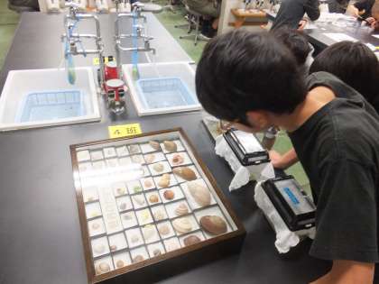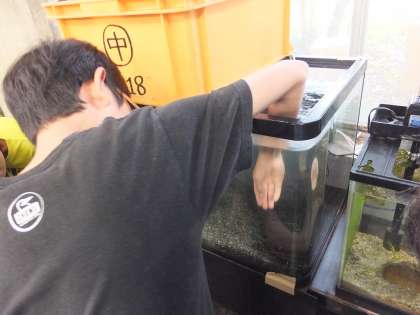 科学センターの生物室にはたくさんの生き物が飼育されていました。世界中のカタツムリの標本やナマズ,イモリ,ドクターフィッシュなど,普段あまり触る機会のない生き物に触ることができました。ナマズやイモリの感触に感激する子どもたちでした。