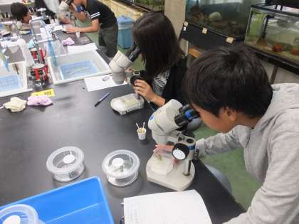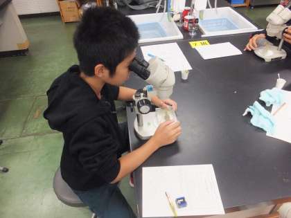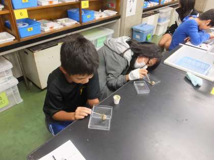 さて,大触覚は光を感じるという機能があることが分かりました。次は,小触覚です。小触覚は,においや音を感じる機能があるということを確かめるために,カタツムリのえさを作り,それを食べる様子を観察しました。カタツムリの口の動きや,頭を振って食べていくことなど,観察を通して気付くことがたくさんあり,夢中で実験に取り組んでいました。