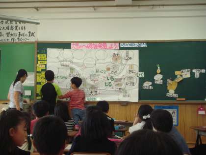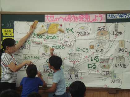 栄養教諭の先生と一緒に,大豆が変身してできた食べ物について考えました。
