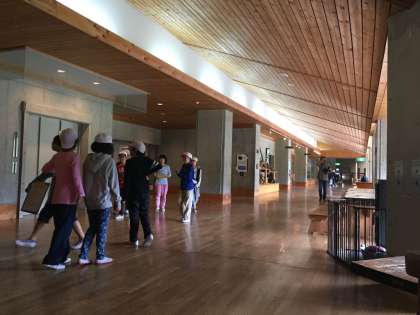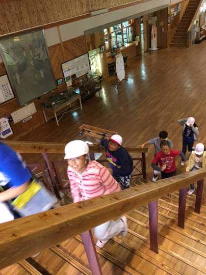 館内ラリーをしました。グループごとに協力して活動中です。お天気も晴れ間が見えてきました。自然の緑がより一層キラキラして見えると子ども達が言ってました。