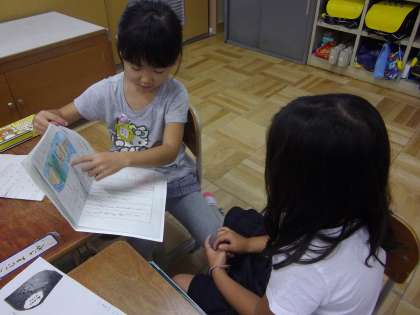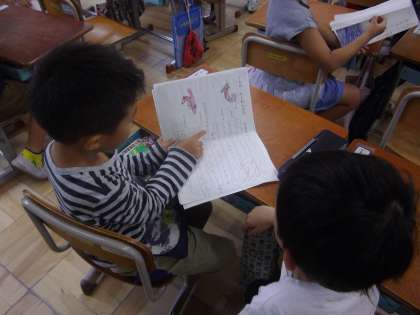 国語科で「うみのかくれんぼ」の学習をしました。ハマグリ,タコ,モクズショイの上手な隠れ方を読み取ったあと,自分が選んだ生き物の隠れ場所や隠れ方をまとめました。今回は,クラスのみんなで交流会をしました。自分の知らなかった生き物の隠れ方を友だちに教えてもらい,「生きものによって隠れ方が違うんだね」「生きものには,すごい力があるな」など子どもたちは,海の生きものの知恵にとても感心していました。