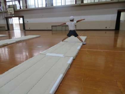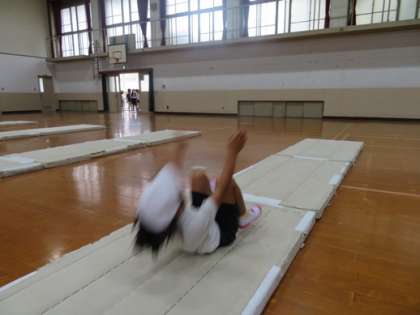 体育ではマット運動の学習をしています。ねらい1では,「今できる技で連続して回ることに挑戦する」,ねらい2では,「少しがんばればできそうな技に挑戦する。」をがんばっています。
