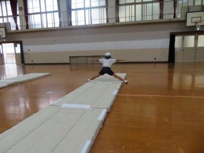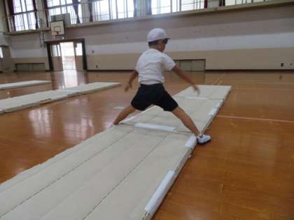 マット運動のねらい2では,「少しがんばればできそうな技に挑戦する。」にチャレンジしています。坂の場や長椅子の場など自分の頑張るめあてに応じて練習の場を工夫しています。学習を進めていく中でできる技が増えてきました。