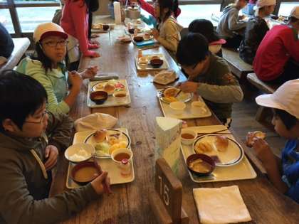 朝ごはんです。バイキングでは学習したことを生かし,栄養のバランスを考えて食べるものを選びます。特にスマイルポテトフライが大人気ですぐになくなります。みんな食欲旺盛でたくさん食べてます。
