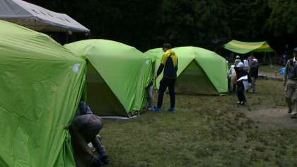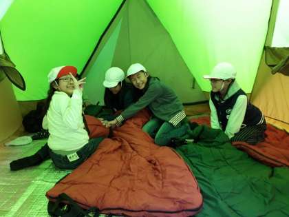 ようやく完成です。あとは,中にシュラフを敷いてからその上にシーツです。最後まで仲良く協力している姿にとても心温まります。なんとか暗くなる前に作業を終えます。