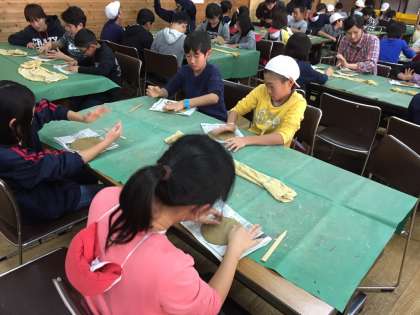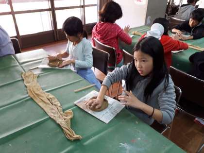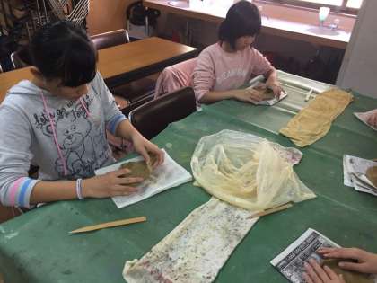 花背焼き作りのスタートです。まずは,粘土を平らにします。その後,自分が作りたい形に成形していきます。どんな形ができるのか楽しみです。