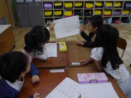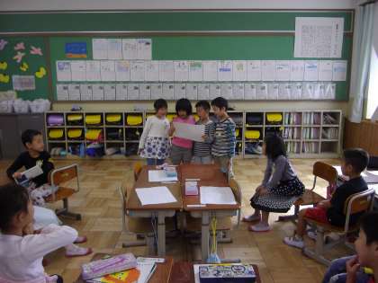 「かずとかんじ」の学習で,一から十までの漢字を用いて,数え唄をつくりました。一人一人作品をつくりましたが,最後は,グループで一つの作品を選んで,発表しました。「りんごは1こ,2こと数えるね」「カレーは,ひと皿,ふた皿って数えてみよう」「ペンギンは1羽,2羽かな」など,数え方をよく考えて楽しく唱えることができていました。