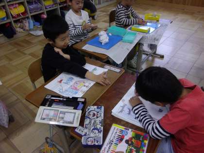 雨の日の休み時間は,教室の中で過ごします。折り紙,お絵描き,粘土など屋内で楽しめるものをそれぞれが選んで遊んでいます。「紙風船の折り方を教えまーす」と声がかかると,興味のある子が集まります。「海の生き物の絵を描こうっと」とどこかで聞えると,自由帳をもって「一緒に描こう」と集まります。いつも外で遊んでいる子も,今日は,教室でお友だちとゆったりした時間を楽しんでいました。