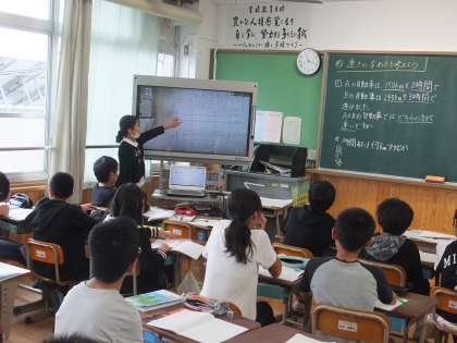 6年生の算数科の学習で,「速さ」の学習に取り組んでいます。1時間あたりどれだけ進むことができるかという考えを図や式で表し,交流しました。新しく時速や分速という言葉を覚えた子ども達,これからも繰り返し練習をして定着させていきましょう。