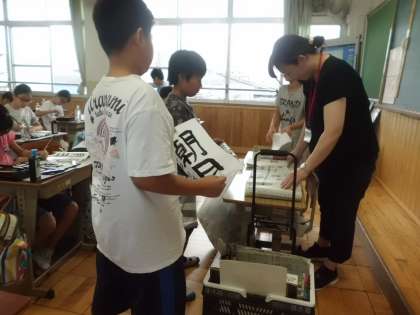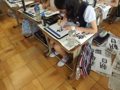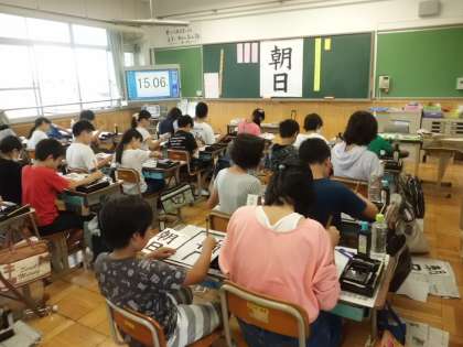 書写では「朝日」の文字にチャレンジ。前回のふり返りをして,気をつけることを確認。今回は清書ということで,子どもたちの集中力は前回以上でした。