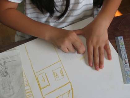 子ども達は2冊の物語を聞きました。そして物語の好きな場面を選び,様子を想像しながら絵に表します。主人公や周りの様子をどのように描くかを考えています。