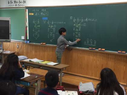 算数の分数の単元で,通分のやり方についての学習を行っています。分母をそろえるためにどう計算したらいいか,一人でじっくり考えたり友達と交流したりする中で分かった子が多いようでした。