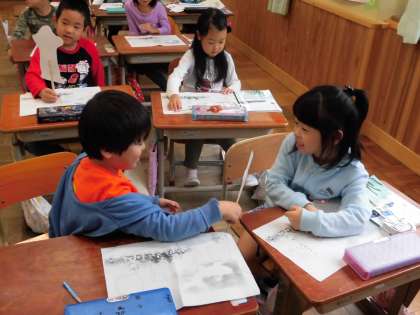 国語では,「くじらぐも」を学習しています。体操をしている1年生の子どもたちの上に,くじらぐもが現れ,仲良くなり,くじらぐもにのって空を旅するというお話です。子ども達は,自分の分身をペープサートで作り,くじらぐもとどんなお話をするのかをペープサートを動かしながら隣の友達と交流しました。「くじらさんとなかよくなりたいな」「ここは,ながめがいいからおいでよう」など,楽しそうに話す姿がみられました。その後,みんなの前でペアで発表しました。物語の学習は,まだ続きます。次は,くじらぐもとどんなお話をしようかと楽しみにしているようでした。
