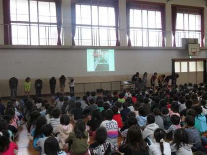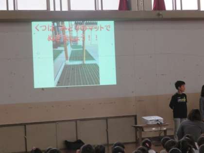 朝会で企画代表委員の発表がありました。これまで取り組んできたあいさつ運動の様子の発表などでした。あいさつの輪が広がるようにこれからもがんばります。